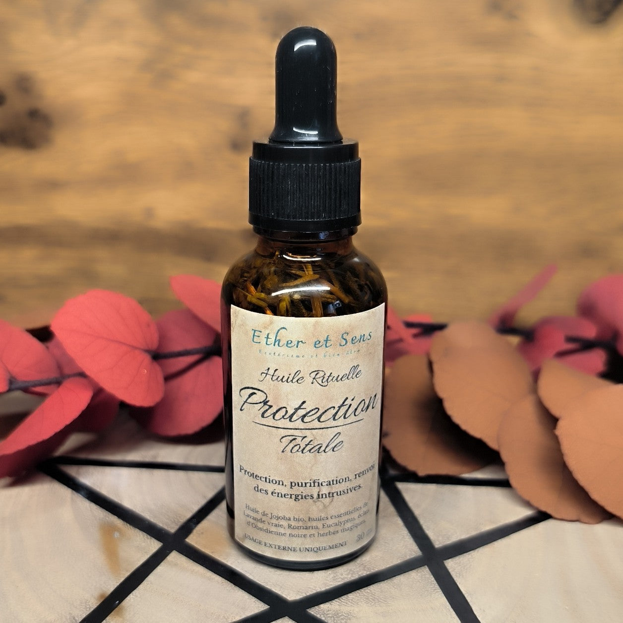 L’Huile "Protection Totale" est une puissante alliée pour purifier les énergies et renforcer votre bouclier spirituel. Élaborée avec de l’huile de jojoba, des huiles essentielles de lavande vraie, romarin et eucalyptus, elle nettoie, protège et clarifie l’aura.